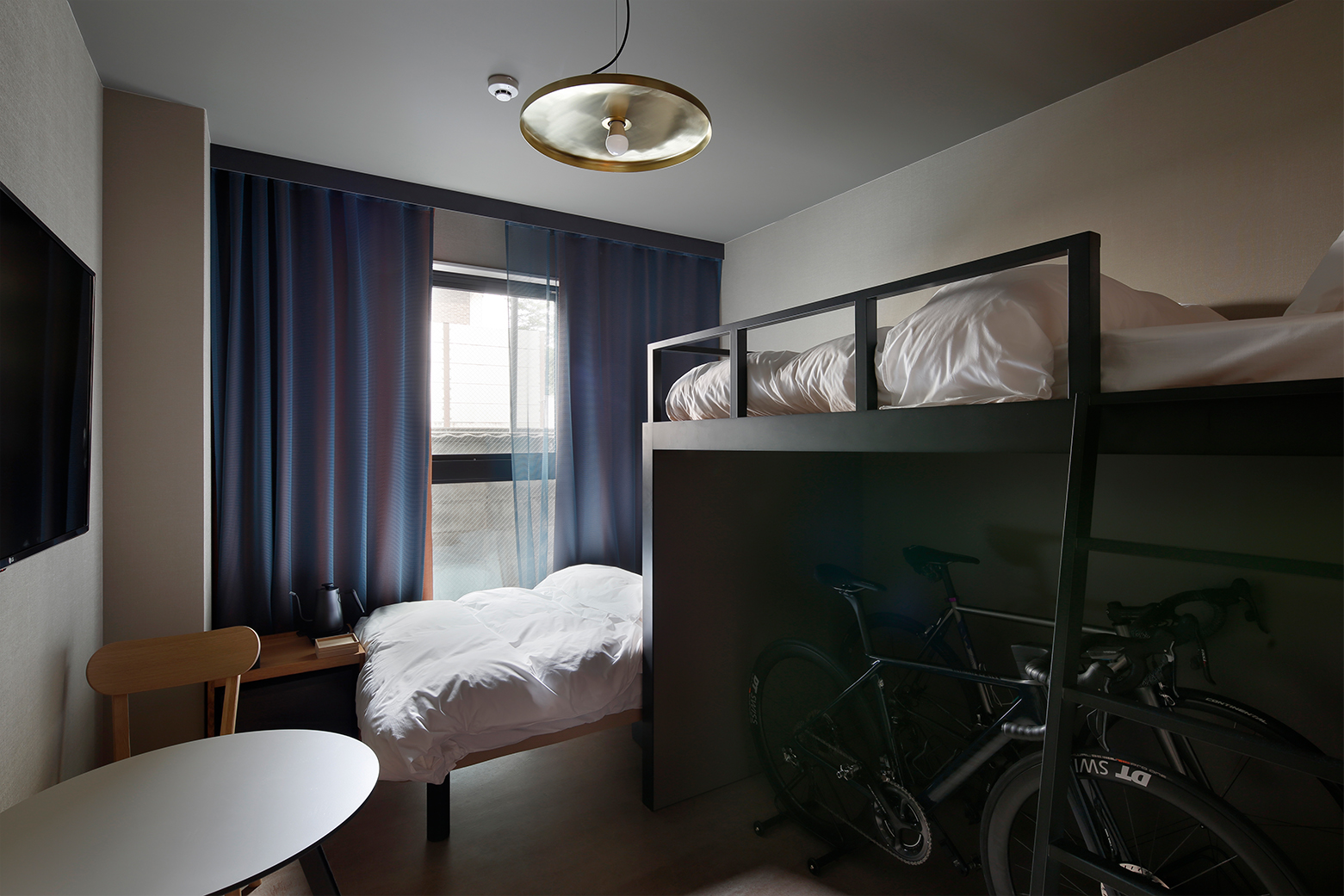 This room features a two-level loft bed and is suitable for longer stays. Its location on the ground floor also makes it a convenient choice for cyclists, who can bring their own bicycles into the room.